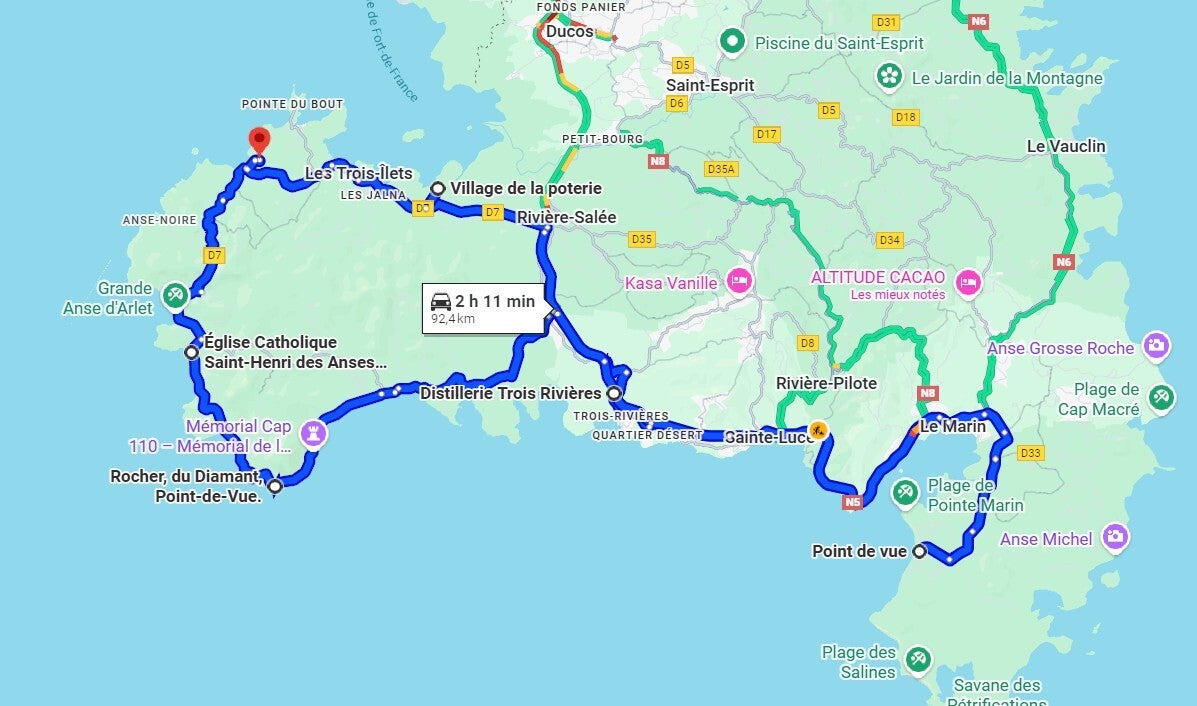 Au départ de l'Anse à l'Ane, dirigez-vous vers le sud en direction des Anses d'Arlet. Vous passerez devant la plage de Grande Anse, puis rejoindrez le bourg des Anses d'Arlet pour une photo sur le ponton devant l'église. A l'issue vous continuerez vers le sud pour découvrir un point de vue remarquable qui surplombe le rocher du Diamant. En route vers le Diamant vous apercevrez la maison du bagnard, puis le mémorial du Cap110. Après avoir traversé Le Diamant, dirigez-vous vers la Distillerie de Trois - Rivières. Vous longerez ensuite la côte Sud (canal de Ste Lucie) en traversant la commune de Ste Luce, du Marin avant de rejoindre le centre de Ste Anne. Sur l'itinéraire du retour, vous pourrez découvrir une vue différente qu'à l'aller et visiter la plage de l'Anse Figuier. Ensuite vous remonterez au Nord jusqu'à Rivière Salée et prendrez la directions des Trois Ilets. Le Village de la Poterie vous accueillera pour vous montrer une grande diversité de produits locaux.
